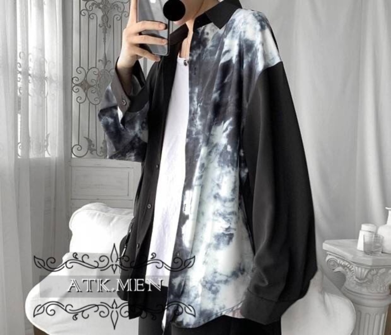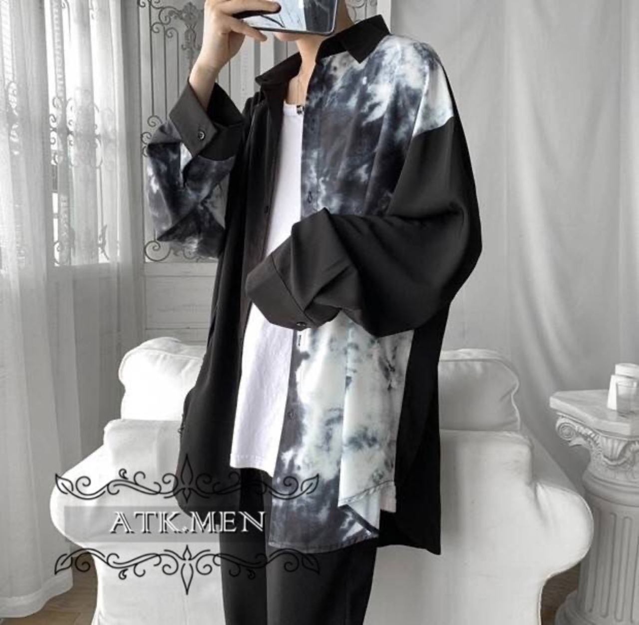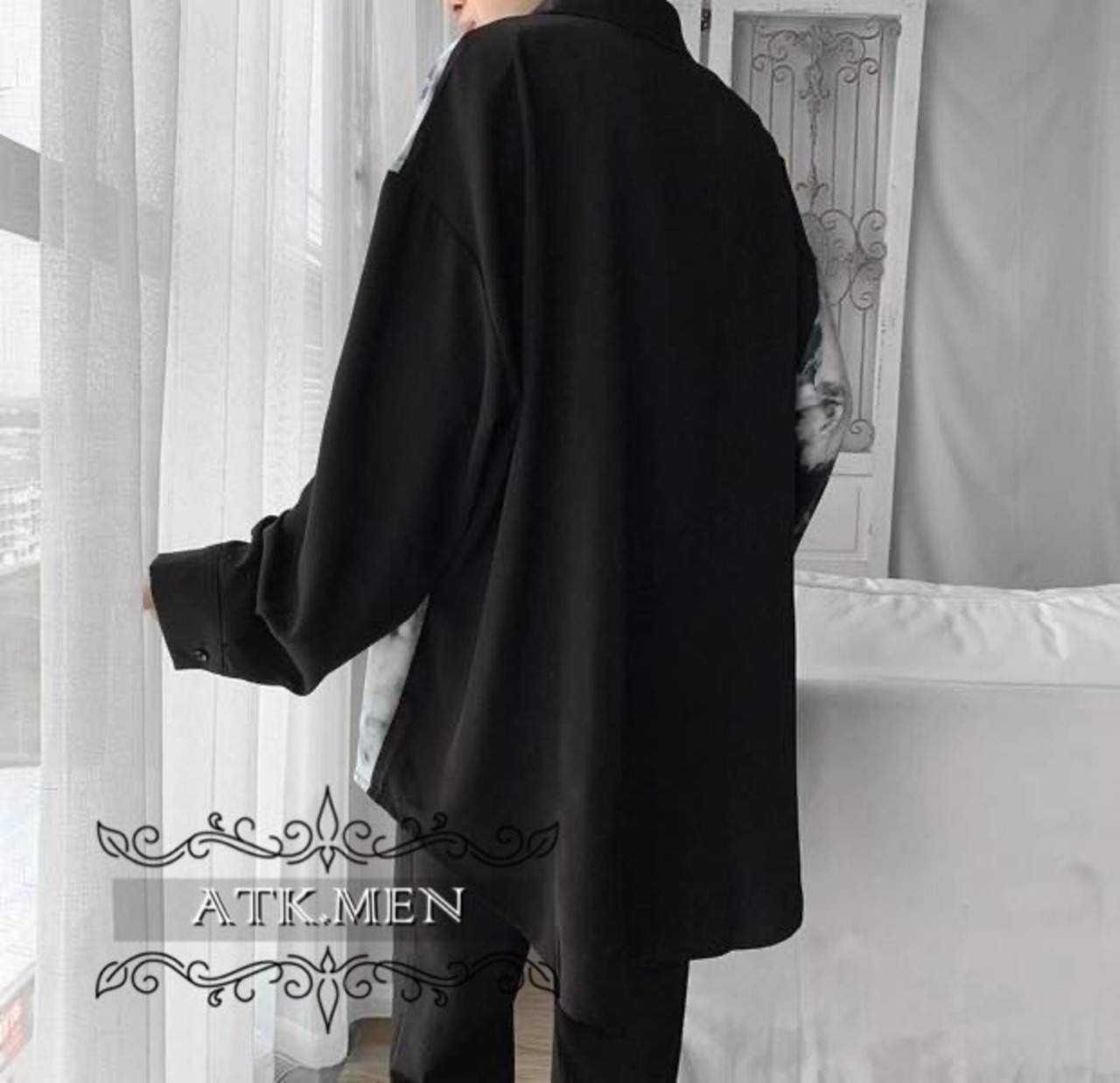 【ATK.MEN】 H112 メンズ シャツ 黒 柄 グレー オシャレ 長袖 非対称 カジュアル 古風
