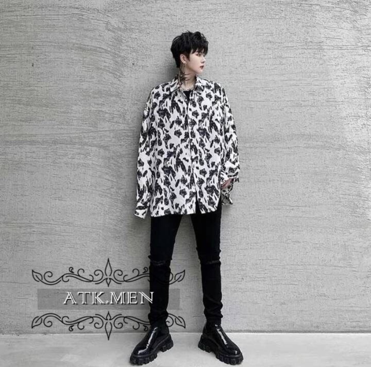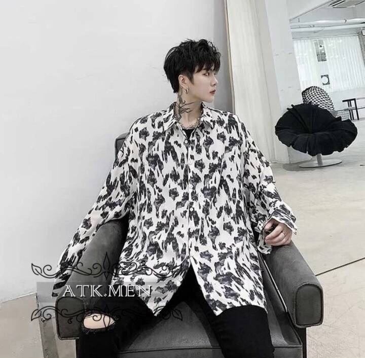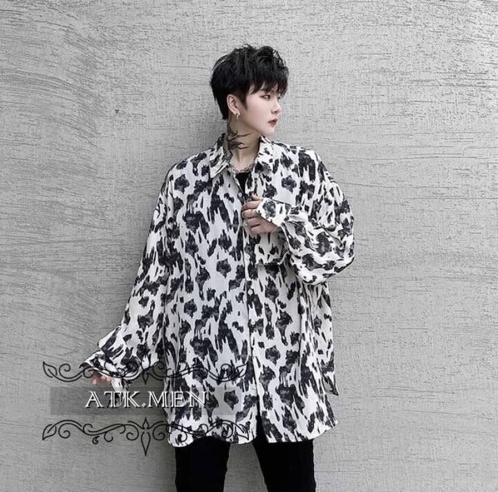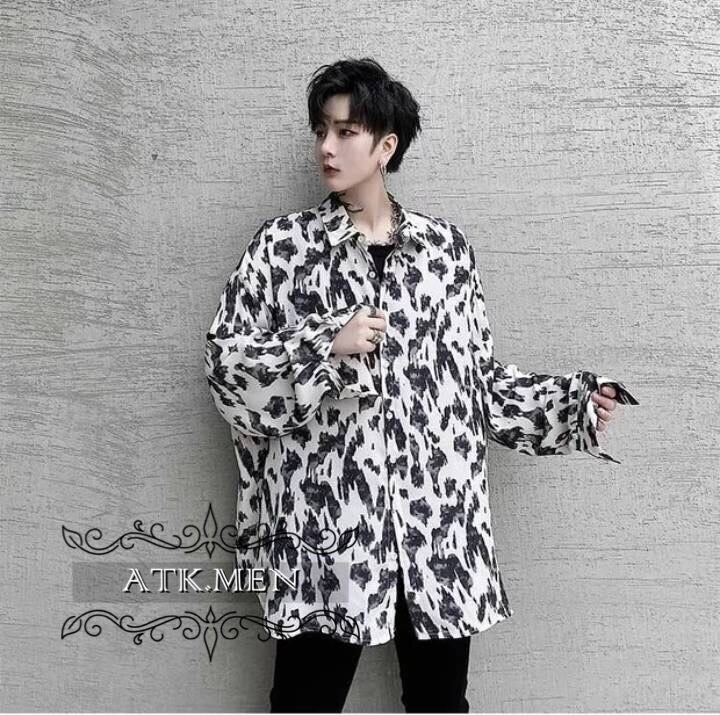 【ATK.MEN】m2527 メンズ 白黒 シャツ 長袖 柄 斑紋 ヒョウ柄 バックサイズ カジュアル 高貴 気質 オシャレ H122