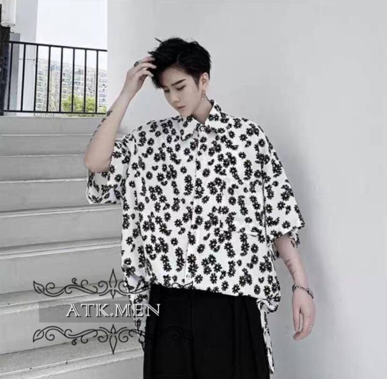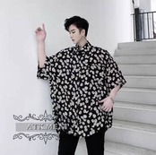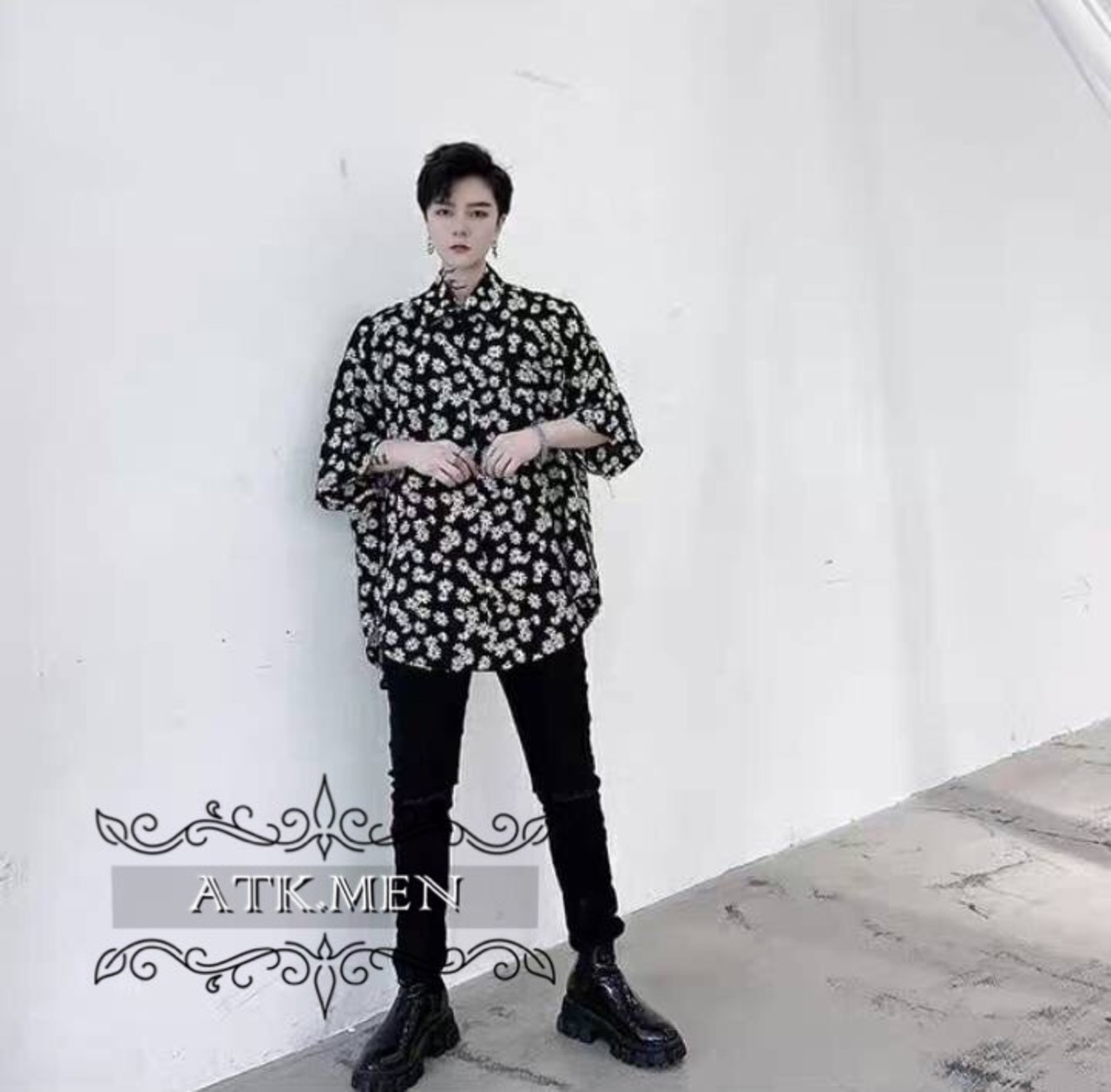 【ATK.MEN】 H111 メンズ 花 水玉 シャツ 黒 ブラック 白 ホワイト 長袖 ビックサイズ 長袖 夏春秋 カジュアル ビジュアル オシャレ