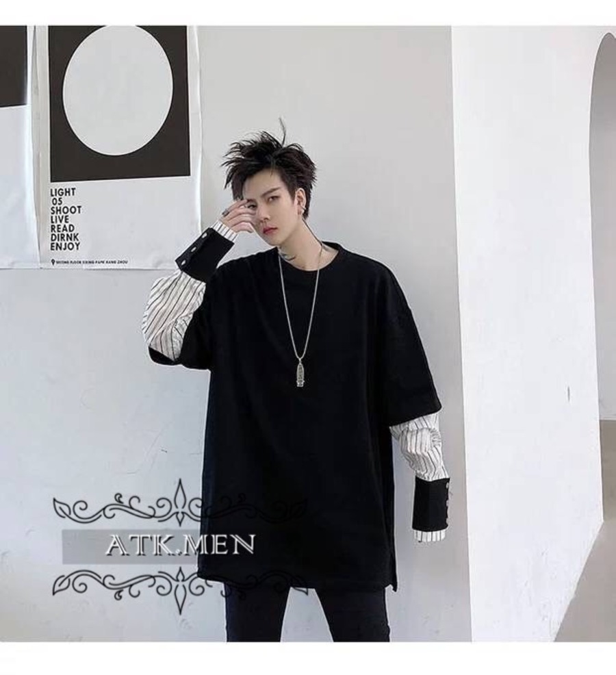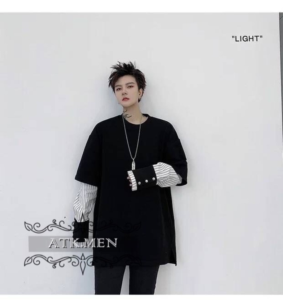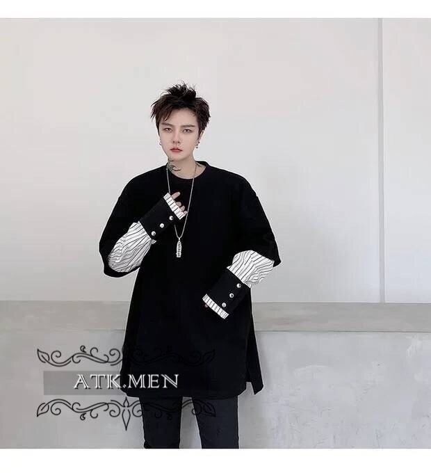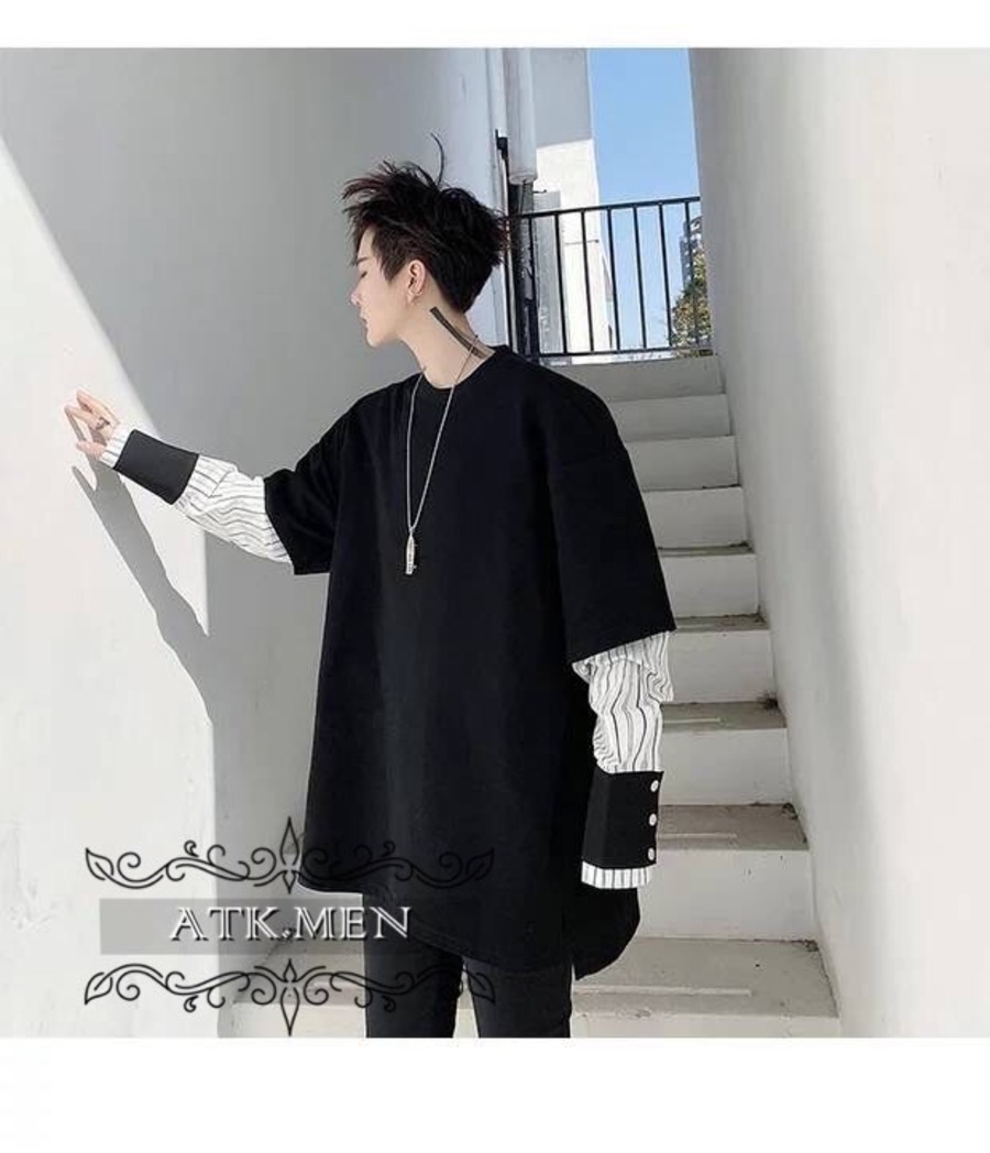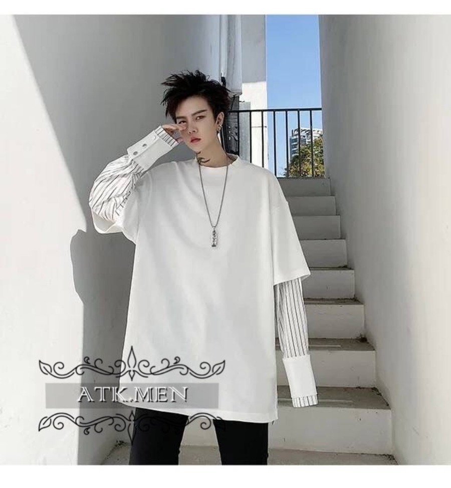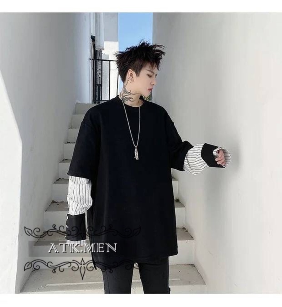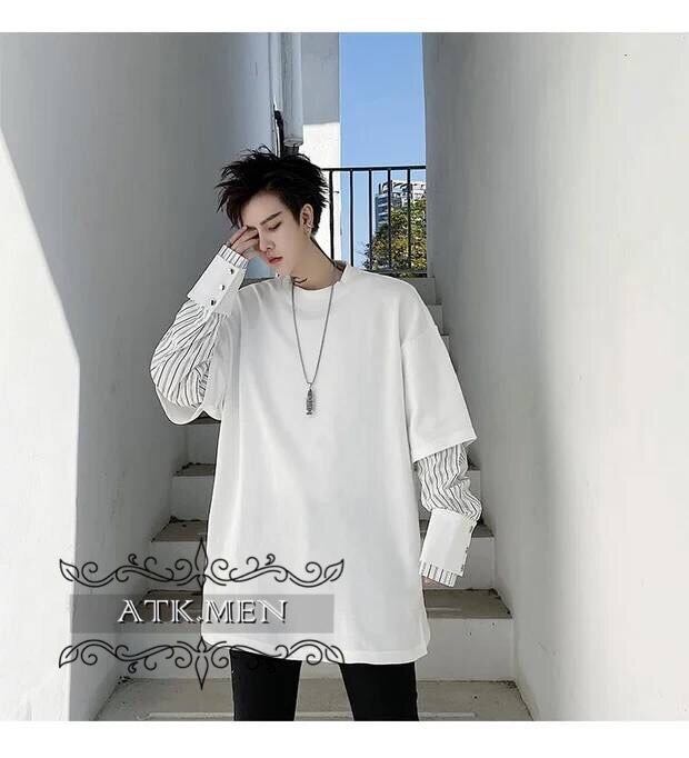 【ATK.MEN】 H54 メンズ 黒 白 デザイン 袖 フェイク 重ね着 長袖 韓国 カジュアル かっこいい