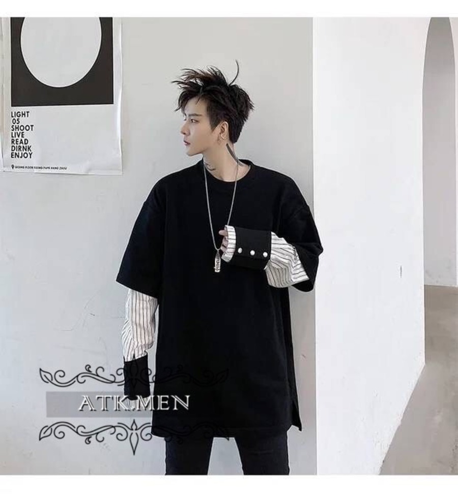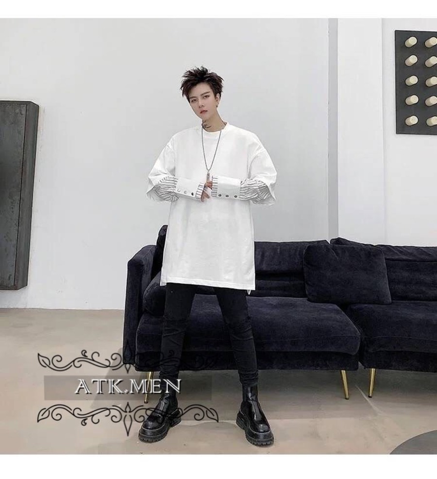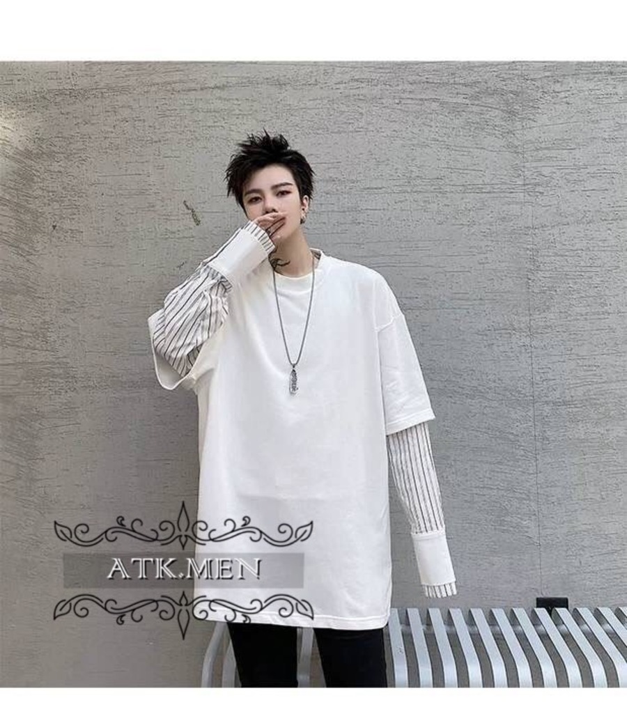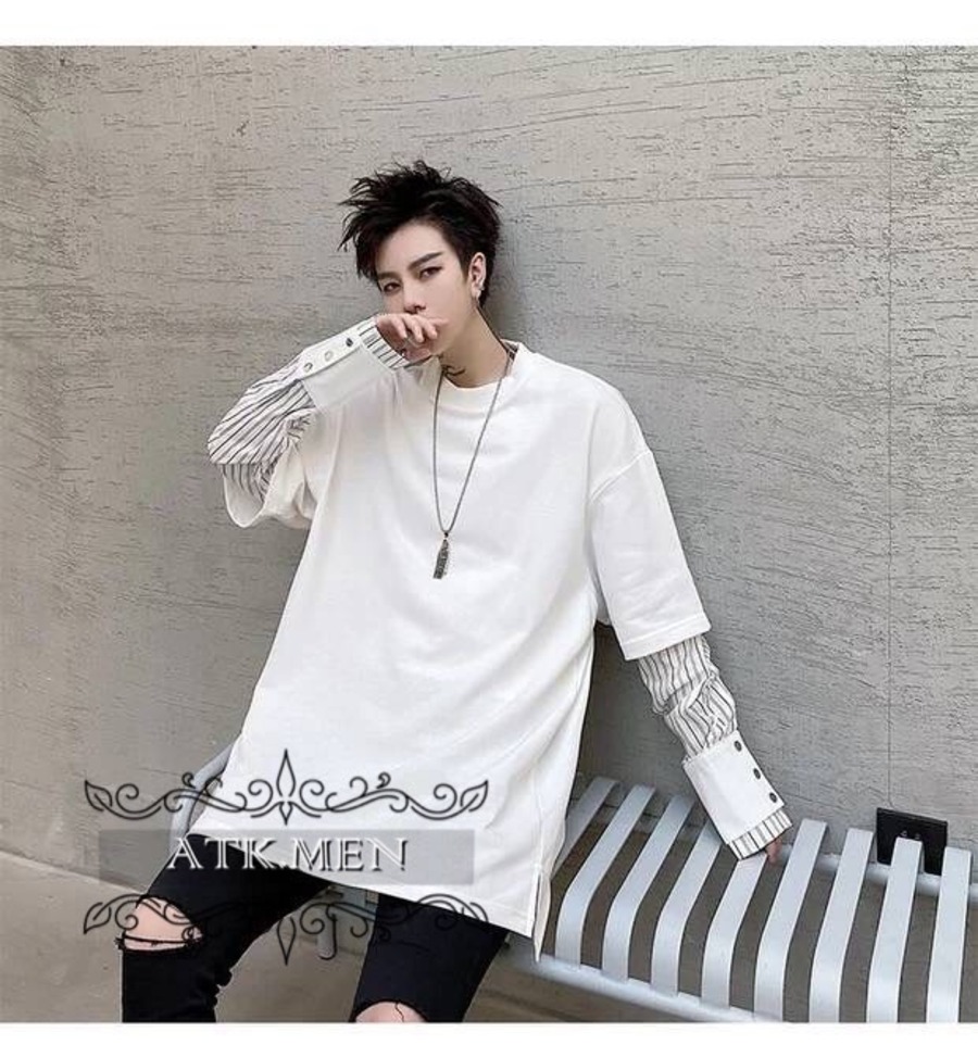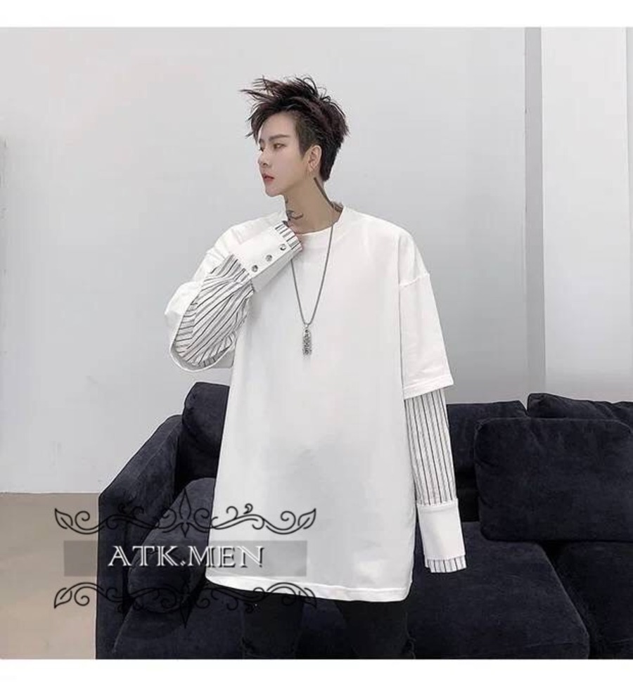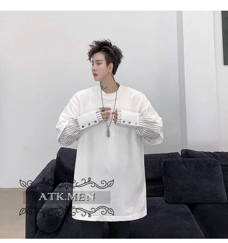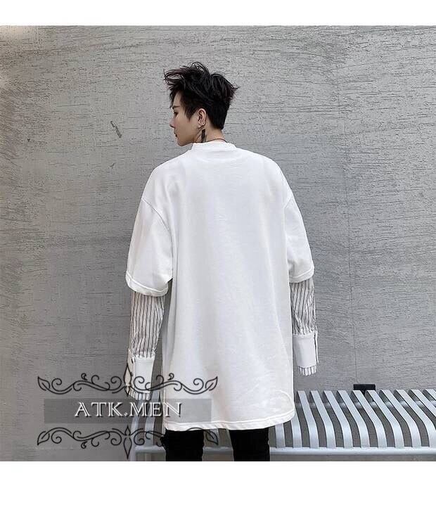 【ATK.MEN】 H54 メンズ 黒 白 デザイン 袖 フェイク 重ね着 長袖 韓国 カジュアル かっこいい