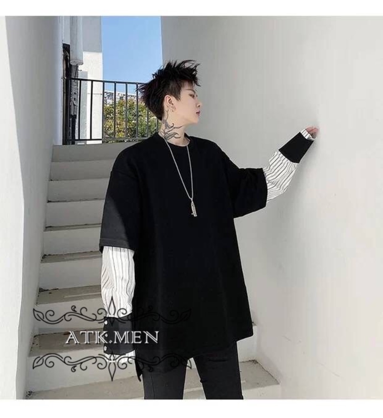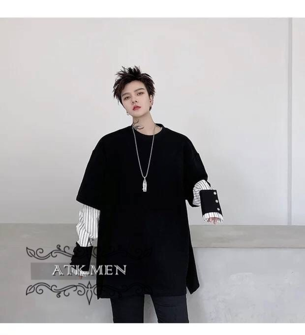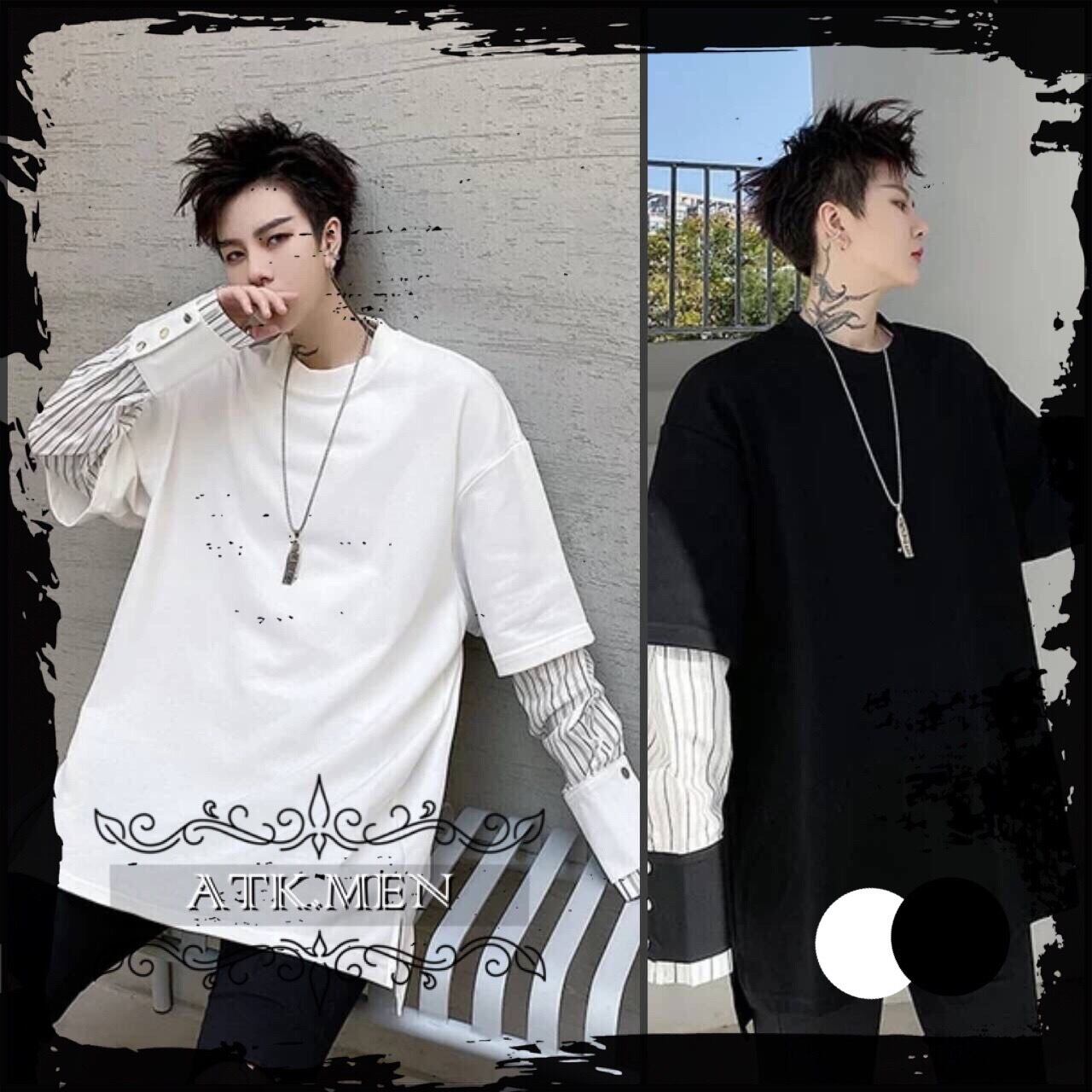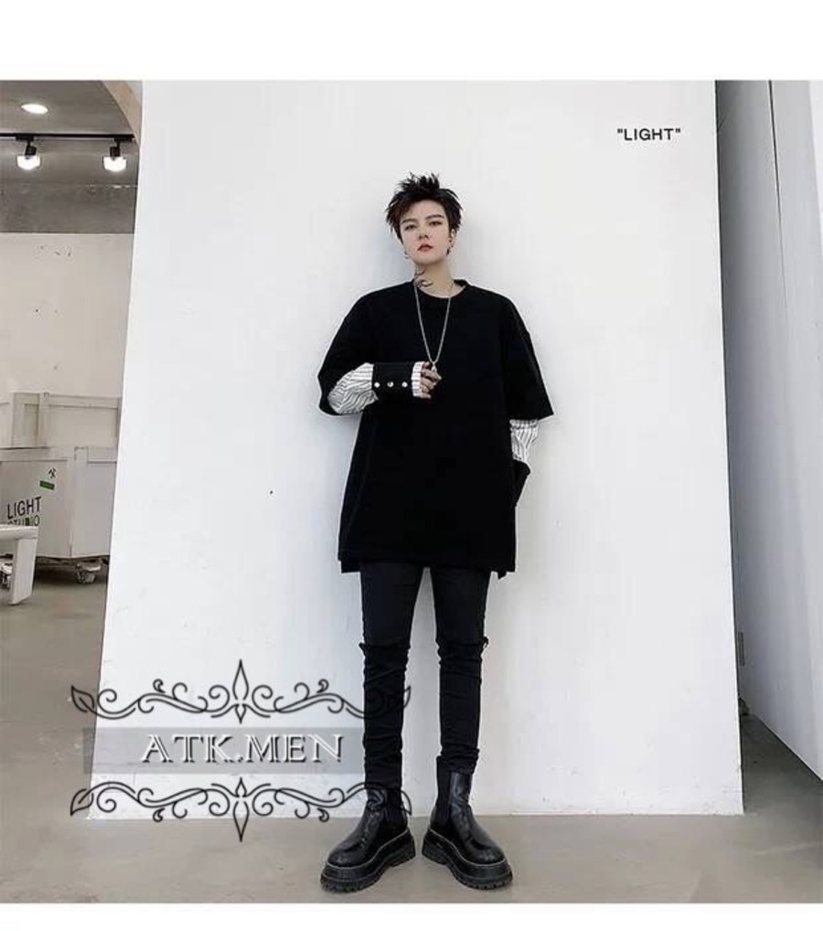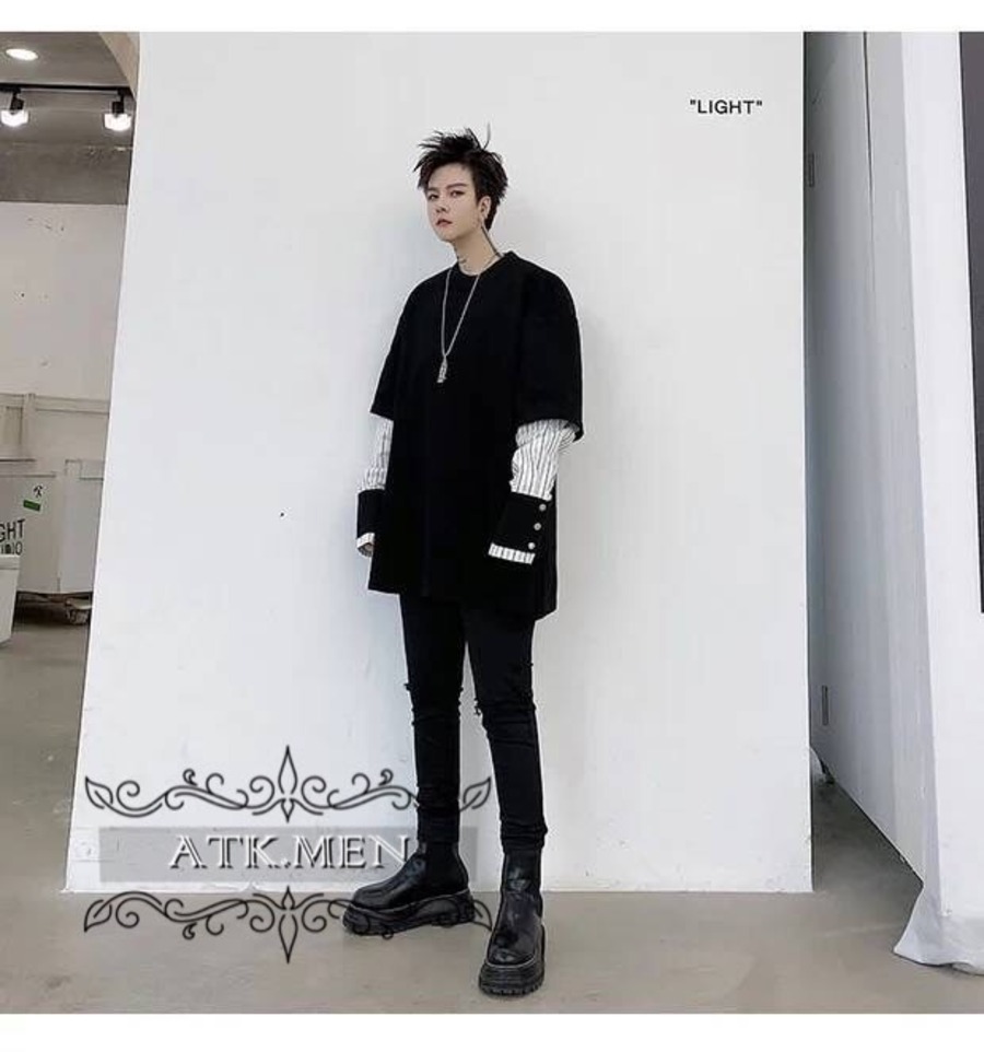 【ATK.MEN】 H54 メンズ 黒 白 デザイン 袖 フェイク 重ね着 長袖 韓国 カジュアル かっこいい